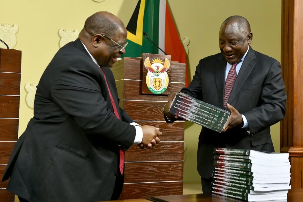 Crystal clear: The Zondo Commission, chaired by the former Chief Justice Raymond Zondo – seen here with President Cyril Ramaphosa during the handover of its report – was unequivocal in identifying public procurement as the primary artery through which State Capture flowed. Photo: GCIS